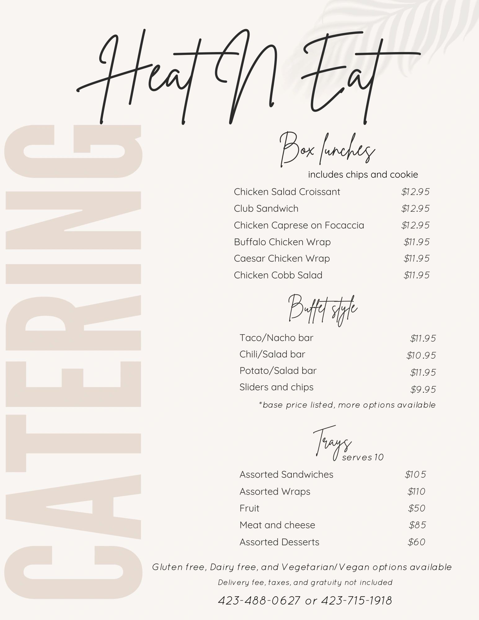 Custom menus available. Call or email for more information.